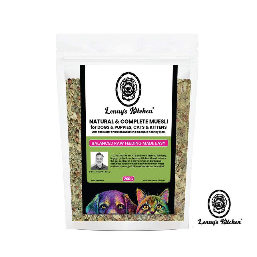 Lenny’s Kitchen Natural & Complete Muesli is formulated in conjunction with renowned and respected Australian Vet, Dr Bruce Syme. For Dogs and Cats, all Life Stages.