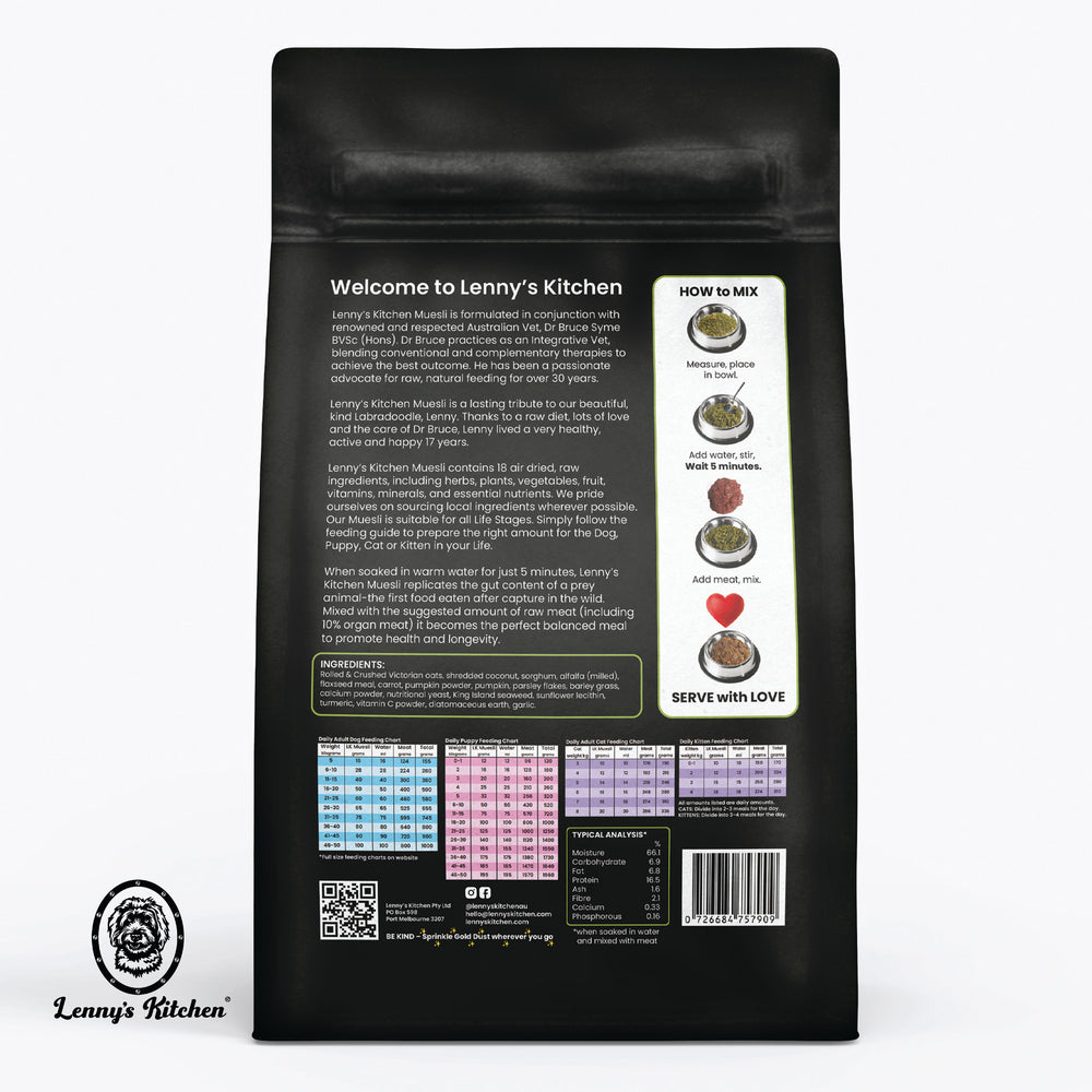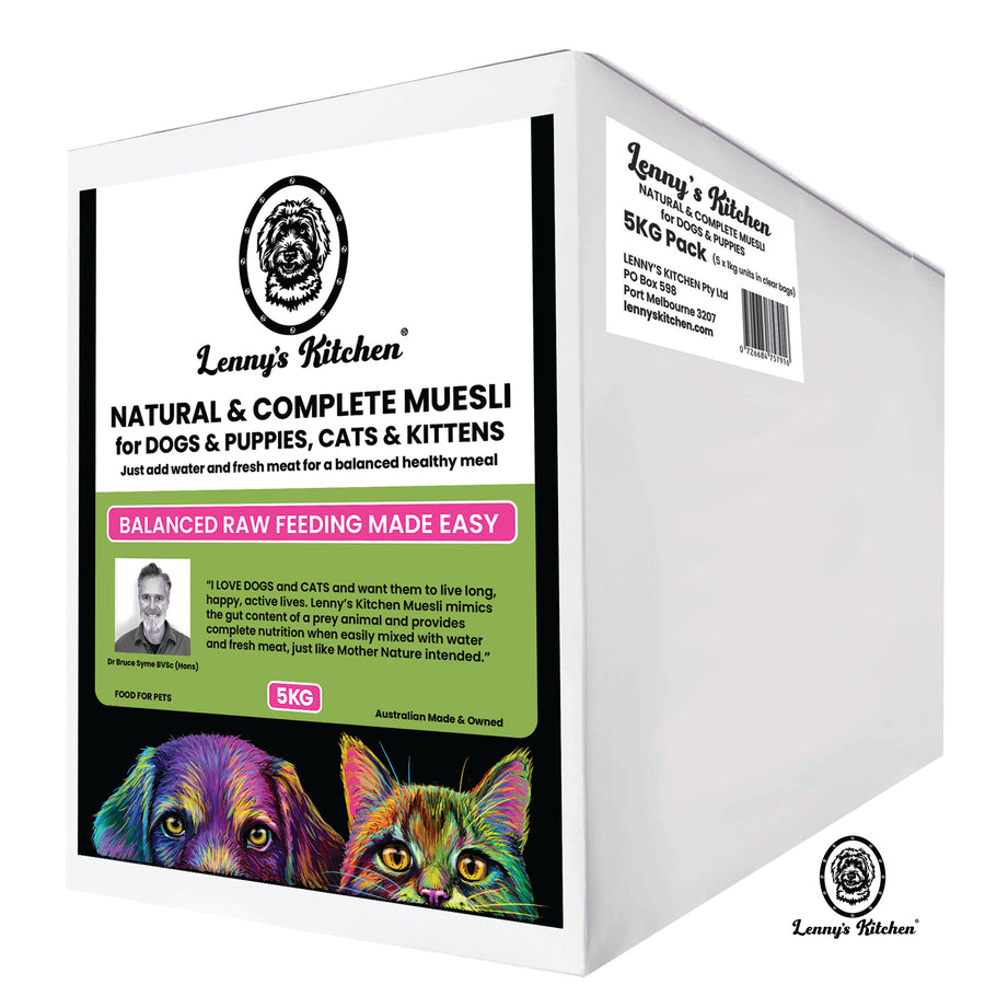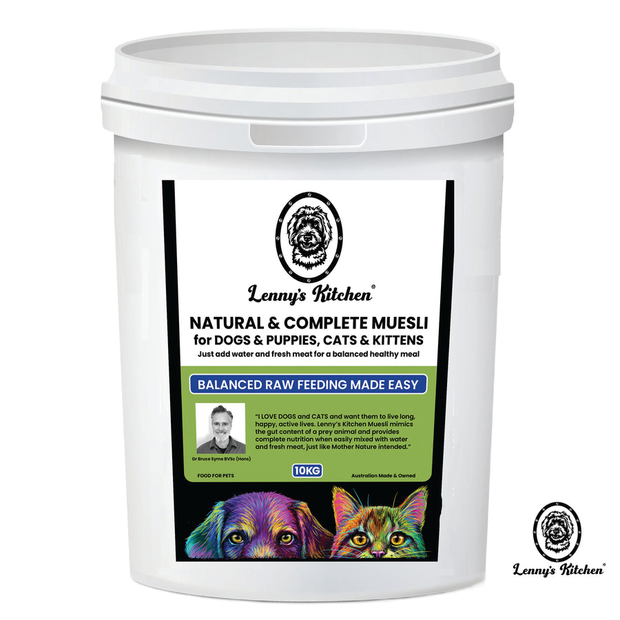 Lenny’s Kitchen Natural & Complete Muesli is formulated in conjunction with renowned and respected Australian Vet, Dr Bruce Syme. For Dogs and Cats, all Life Stages.
