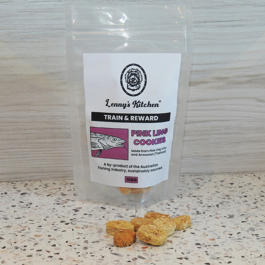 Pink Ling Cookies are simply Pink Ling Trim mixed with arrowroot (tapioca) and gently baked. Sourced from South Australia, the flesh is a by-product of the commercial fishing industry.